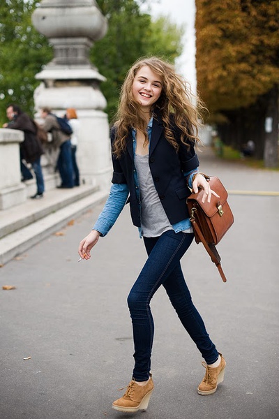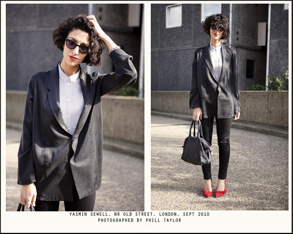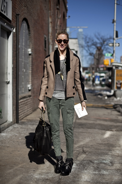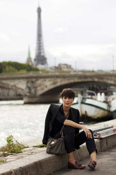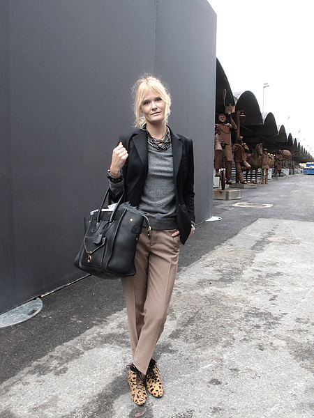 我很喜歡看女生穿西裝外套加領口很鬆的T-shirt, 再配件很窄的褲子,super !