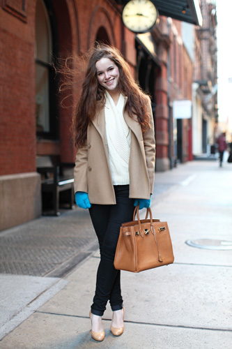 現在把目光移到右邊這位女士, 各位, camel coat , 駝色大衣, 我還要說更多嗎?