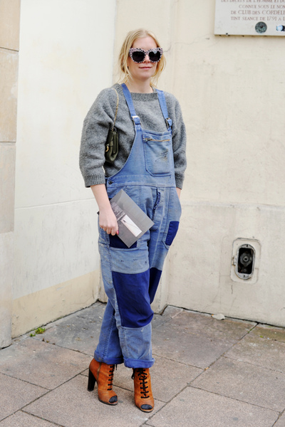 圓領毛衣塞進牛仔吊帶褲也可愛, 但是她的眼鏡和高跟鞋讓她不只年輕, 還多了個性.