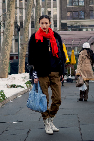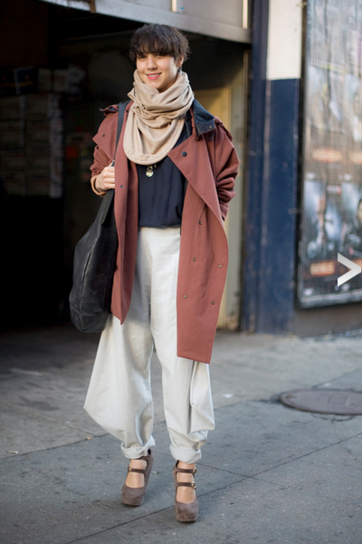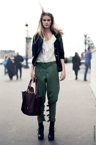橄欖綠+繫帶白靴, 我覺得是種很叛逆的組合, 不是那麼和諧, 但我無論如何會多看幾眼.