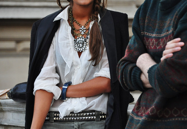 女生穿襯衫, 如果不想領口太空, 但又覺得打領帶蝴蝶結太男生氣的話, 頸鏈或胸針也很適合拿來當替代.
